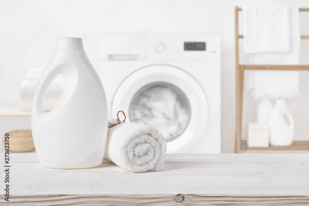 Tableau sur toile Plain detergent bottle on wood over defocused laundry room interior