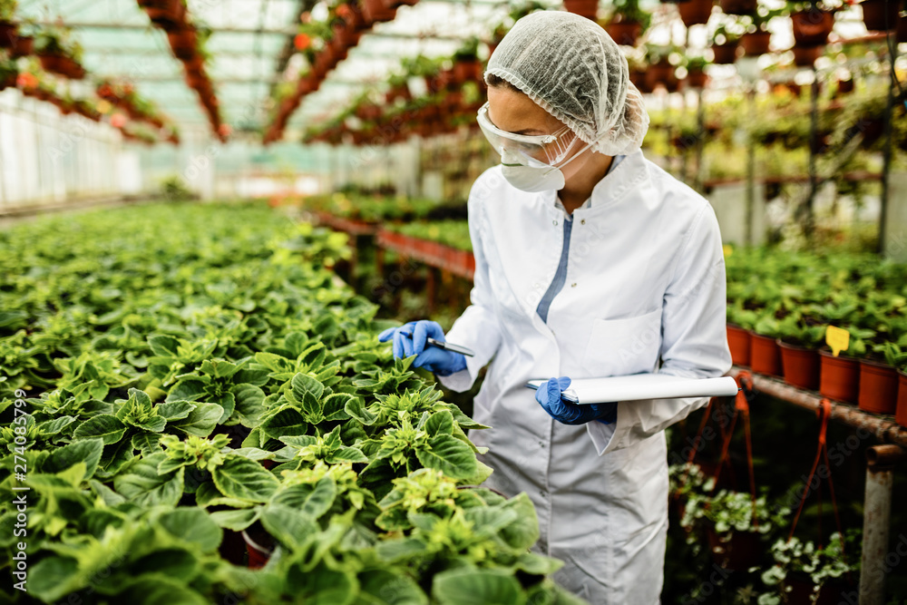 Tableau sur toile Greenhouse botanist examining growth of potted plants.