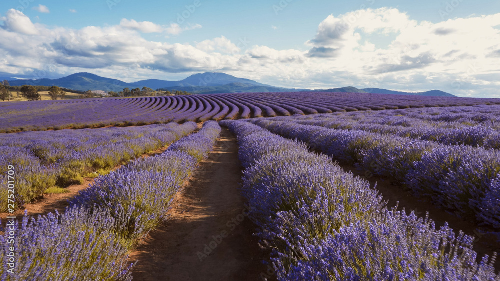 Tableau sur toile late afternoon gimbal shot of lavender rows in tasmania
