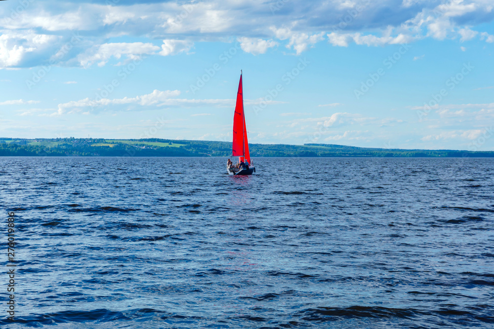 Tableau sur toile sailboat with scarlet sails in the middle of a wide lake