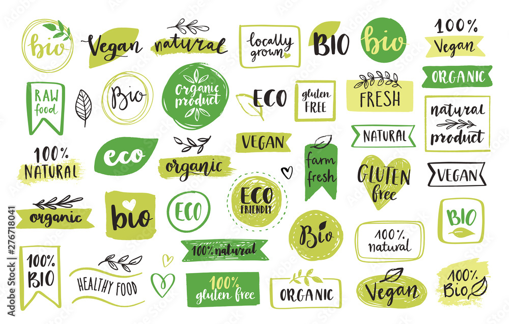 Tableau sur toile Organic food, eco, vegan and natural product icons and elements set for food market, ecommerce, organic products packaging, healthy life promotion, restaurant Hand drawn vector design elements
