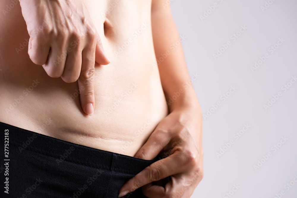 Tableau sur toile Closeup of woman showing on her belly dark scar from a cesarean section