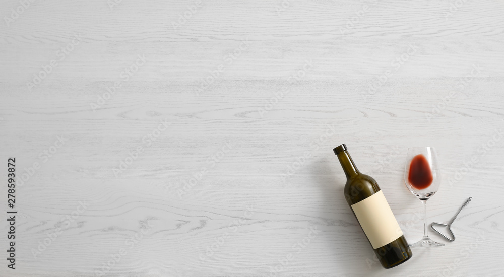 Tableau sur toile Flat lay composition with bottle of wine and elegant glass on white wooden background