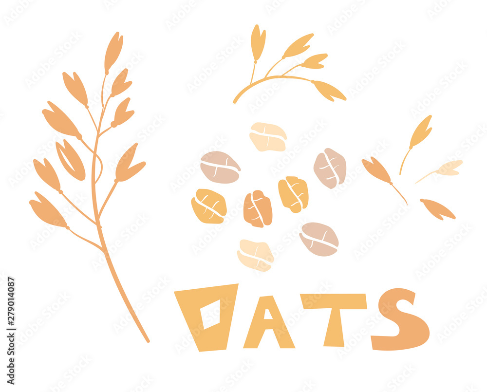 Cereal plants, agriculture industry organic crop products for oat groats flakes, oatmeal packaging design. A handful of oats seed. Template for banner, card, poster, print and other design projects.