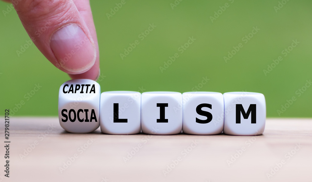 Tableau sur toile Hand flips a dice and changes the word Socialism to Capitalism, or vice versa