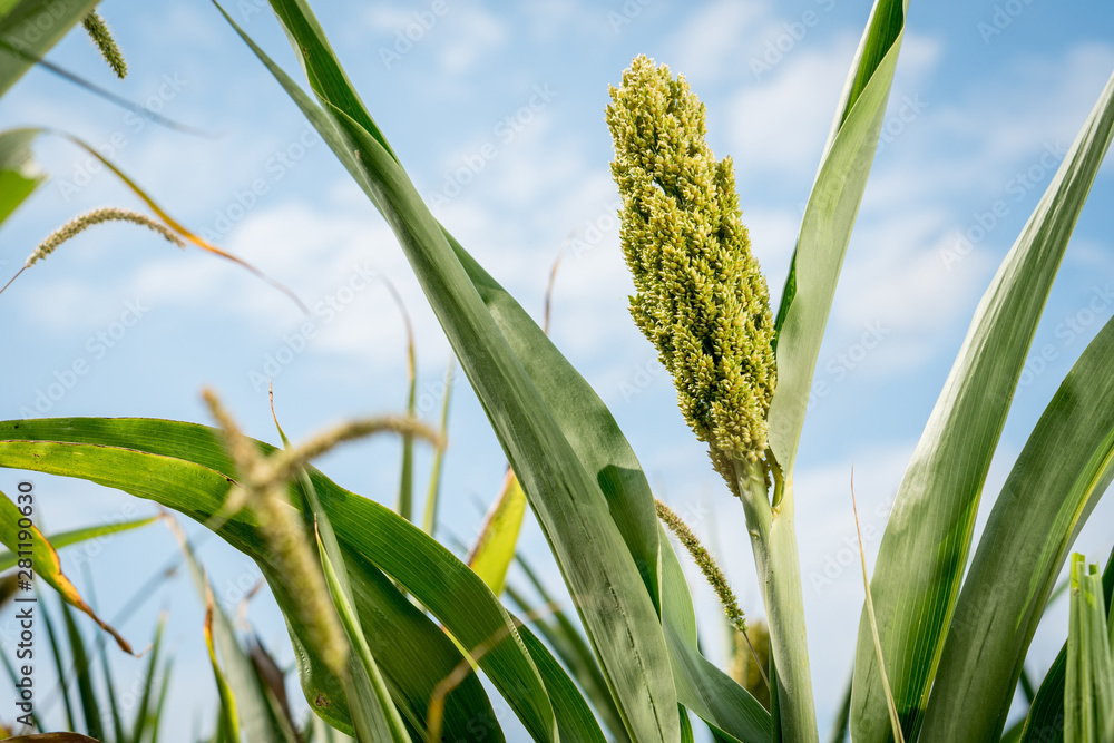 Tableau sur toile Young sorghum (millet, jowari) sprouts on a farmers field.