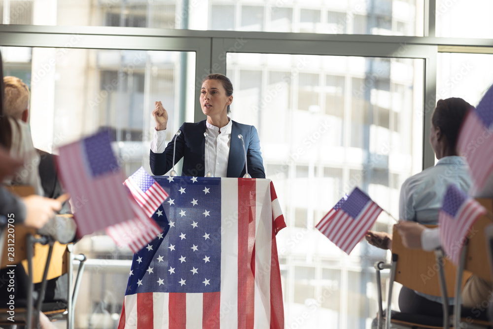 Tableau sur toile Mature Caucasian businesswoman speaking to business people in conference room du