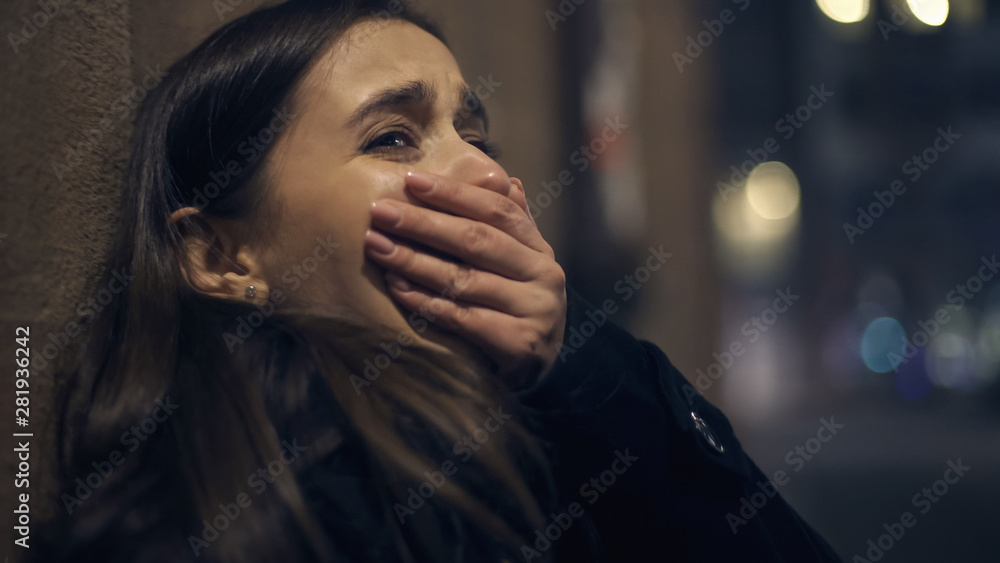 Tableau sur toile Shocked robber victim crying at night street, panic attack, psychological trauma