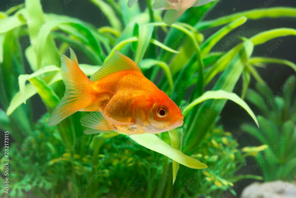 Tableau sur toile Gold fish or goldfish floating swimming underwater in fresh aquarium tank with green plant