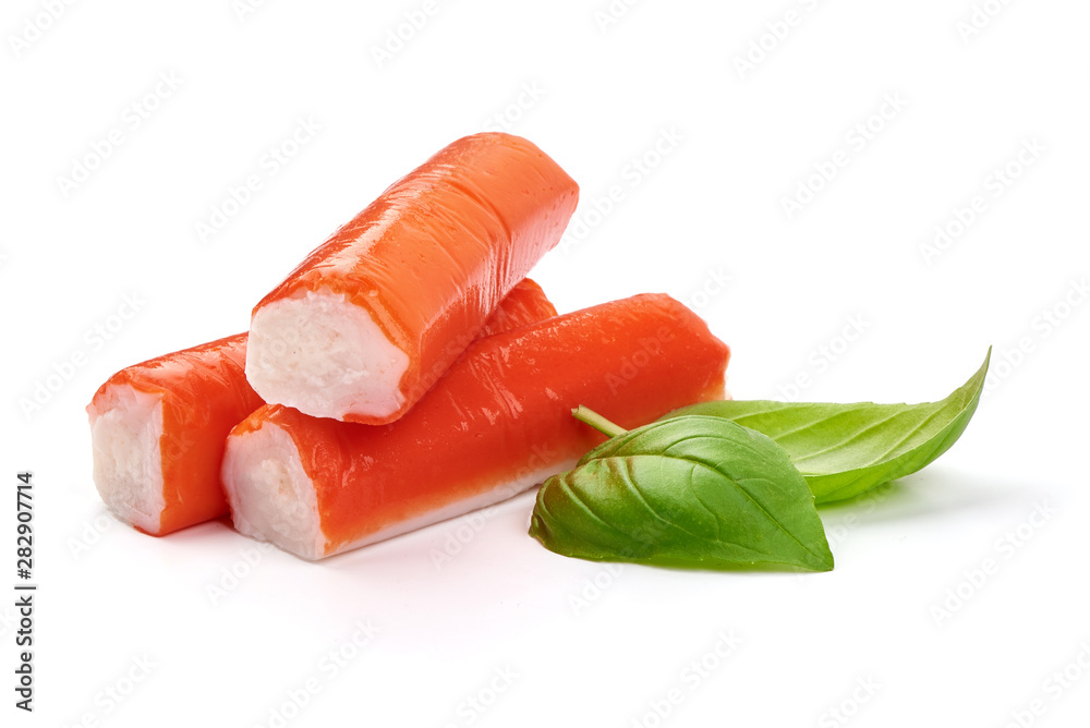 Delicious, fresh crab sticks, crabmeat, isolated on white background