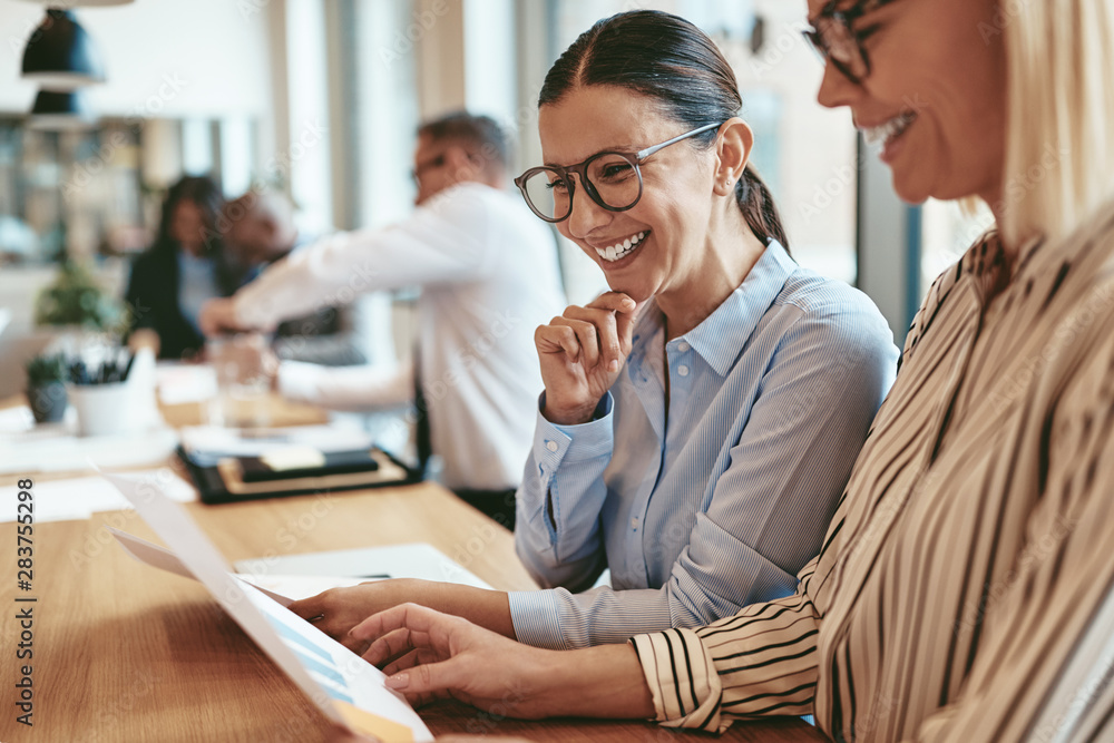 Tableau sur toile Smiling businesswomen going over paperwork together at an office