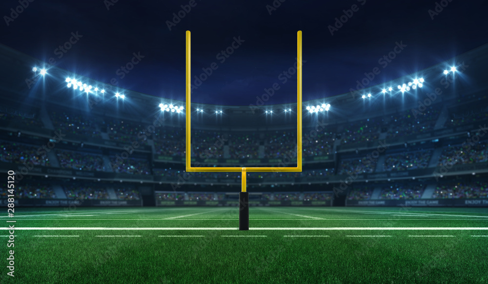 Tableau sur toile American football league stadium with yellow goalpost front and fans, illuminate