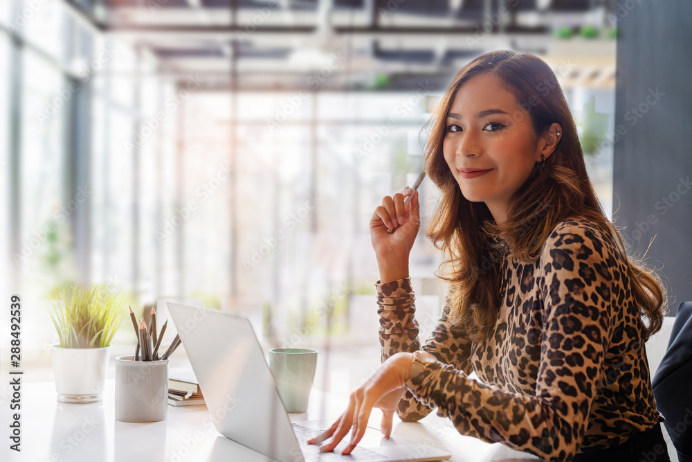 Tableau sur toile Confident asian businesswoman smiling and look at camera while working on laptop at modern office