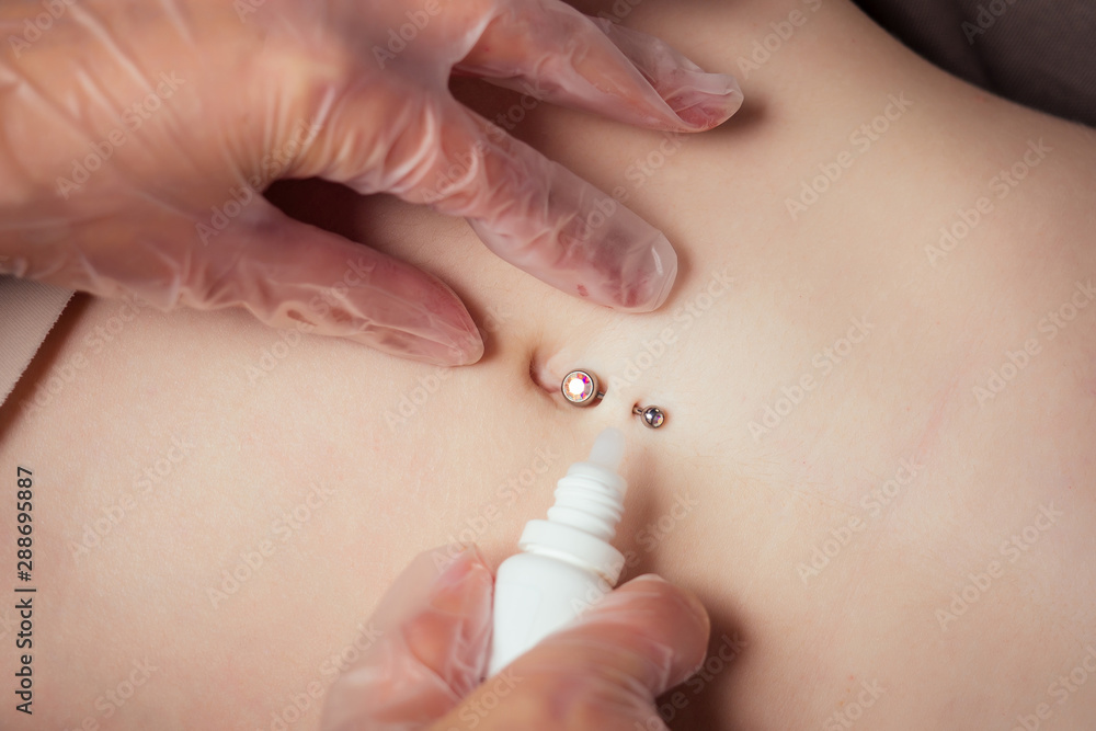 Tableau sur toile hand in a rubber glove close-up of master pierce the navel by belly of a young woman with a bandage and cotton on her stomach titanium piercing