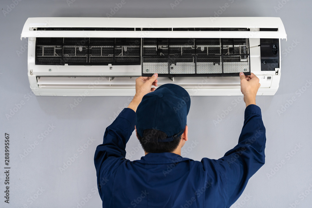 Tableau sur toile technician service removing air filter of air conditioner for cleaning
