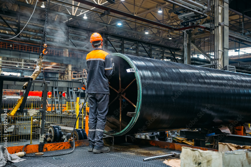 Tableau sur toile Worker installs clamping ring on coated pipe