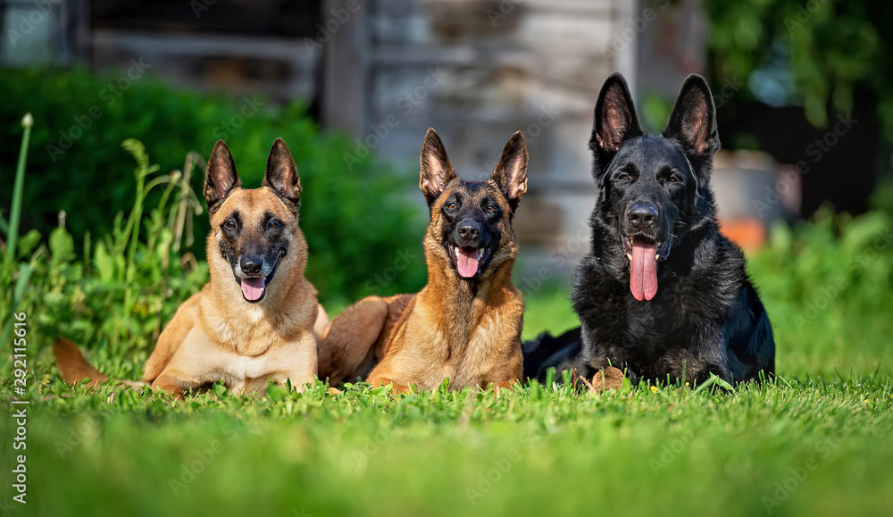 Tableau sur toile Two belgian shepherd malinois and one german shepherd on the grass