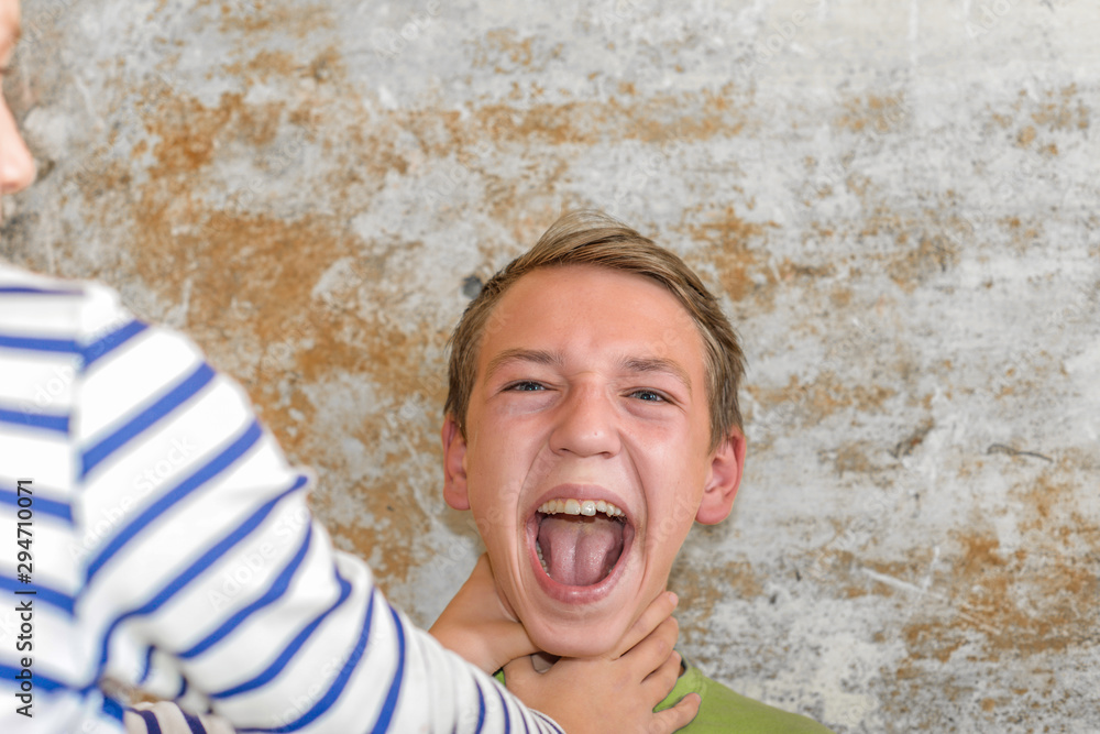 Tableau sur toile The girl strangles the boy, and he raised his hands up and can not breathe