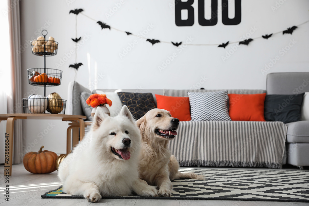 Tableau sur toile Cute dogs in room decorated for Halloween