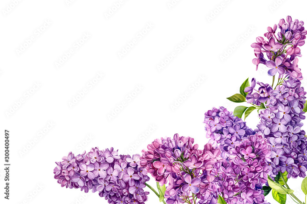 Tableau sur toile frame of lilac flowers on an isolated white background, watercolor illustration,