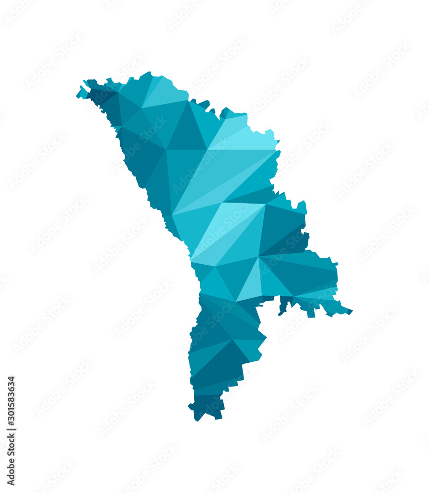 Vector isolated illustration icon with simplified blue silhouette of Moldova map. Polygonal geometric style, triangular shapes. White background