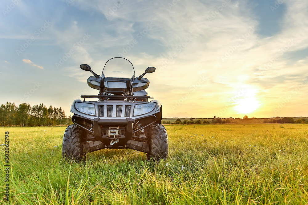 Tableau sur toile gray ATV on grass in summer at sunset with copy space