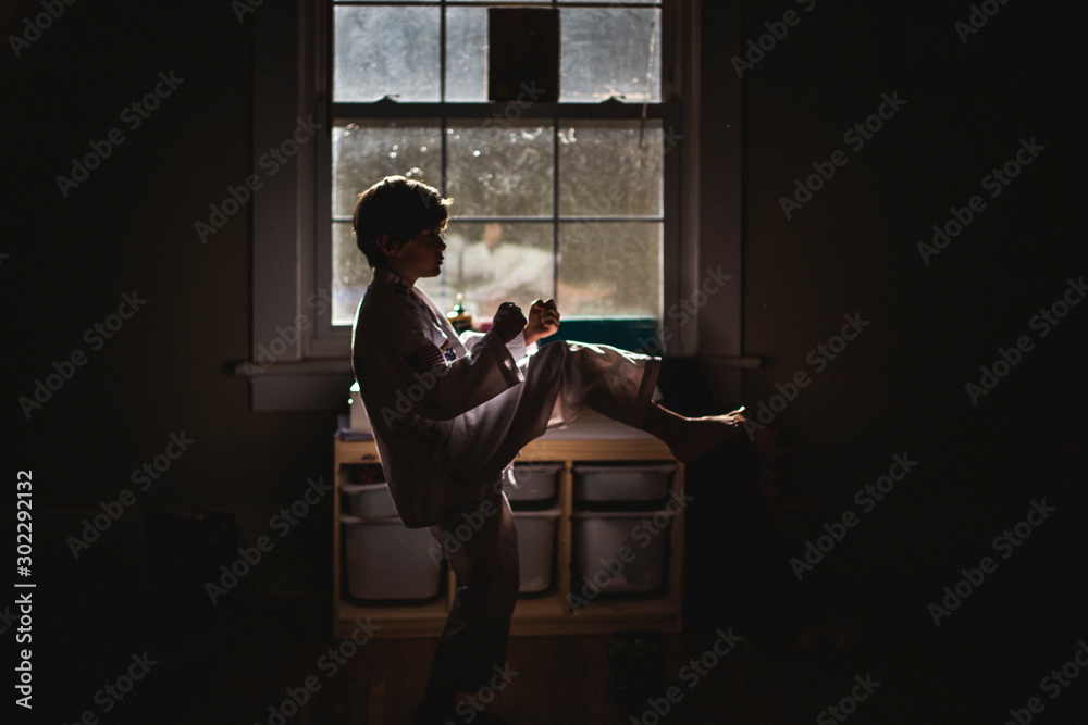 Tableau sur toile A small boy in uniform practices Taekwondo in early morning light