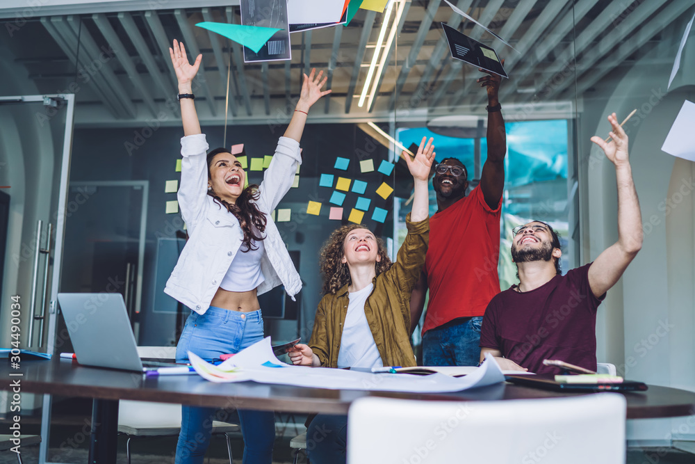 Tableau sur toile Laughing friends throwing papers up in excitement