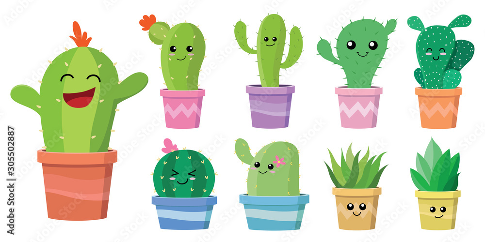 Tableau sur toile set of cute cartoon cactus and succulents with funny happy faces, expression in flowerpot