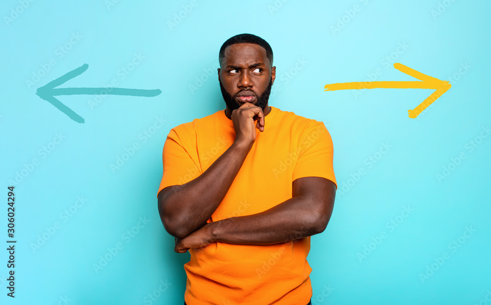 Tableau sur toile Confused Man have to choose the right arrow to follow