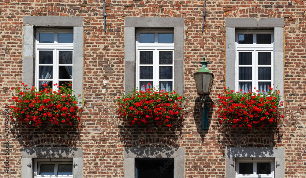 Tableau sur toile detail of brick house with beautiful red flower boxes outside in Aachen, Germany