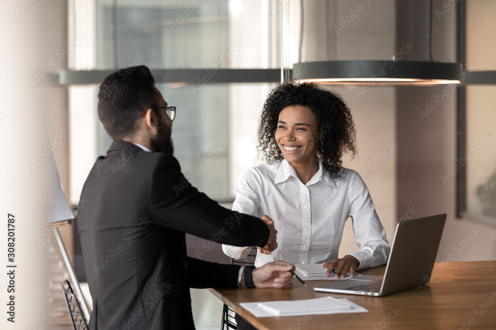 Tableau sur toile Smiling diverse business partners handshake closing deal at meeting