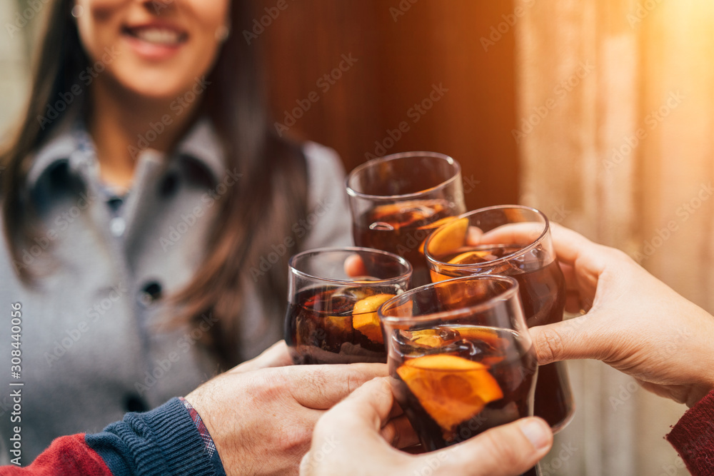 Tableau sur toile Cheers! Group of friends enjoying a vermouth in bar or pub - Young people hands
