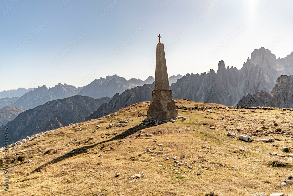 Tableau sur toile Huge Stone Monument on a mountain with meadow and rocky mountains in the backgro