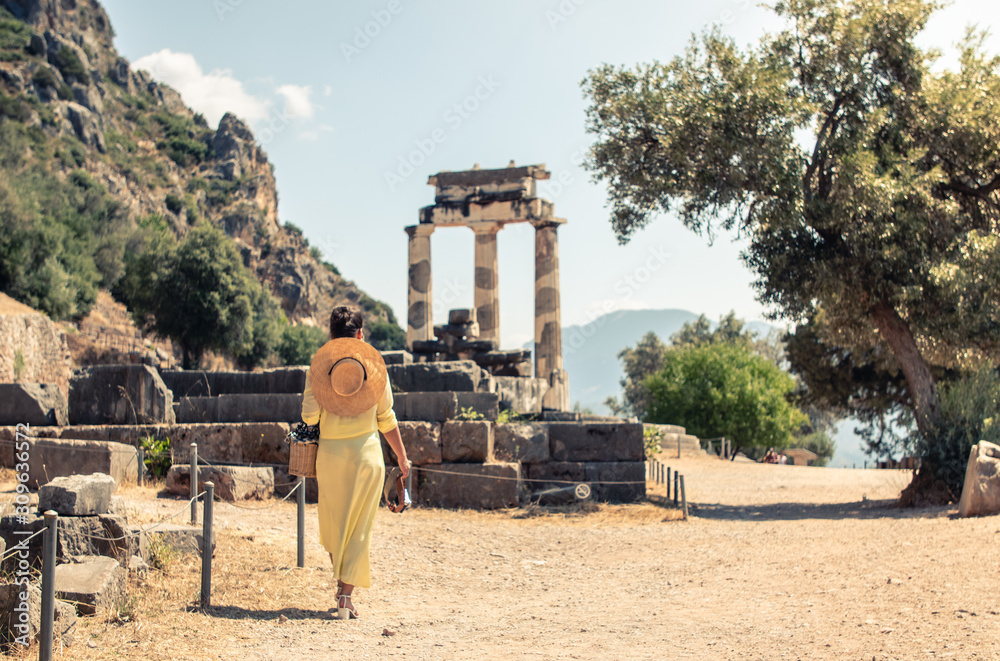 Tableau sur toile Young woman tourist at Sanctuary of Athena, Delphi Greece