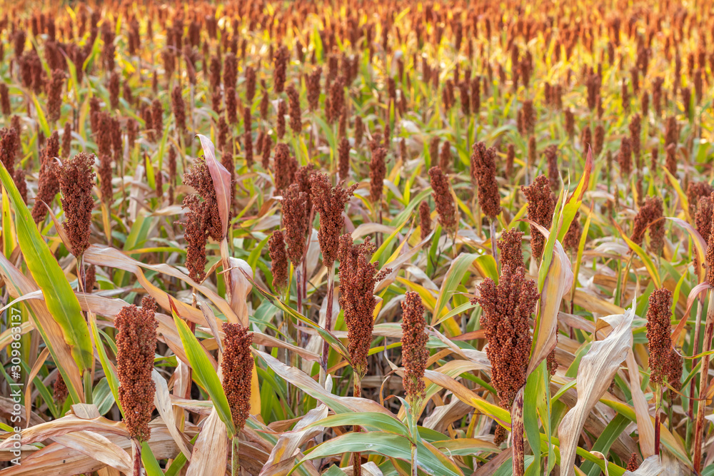 Tableau sur toile Sorghum, which is ripe, is red, waiting for harvest.