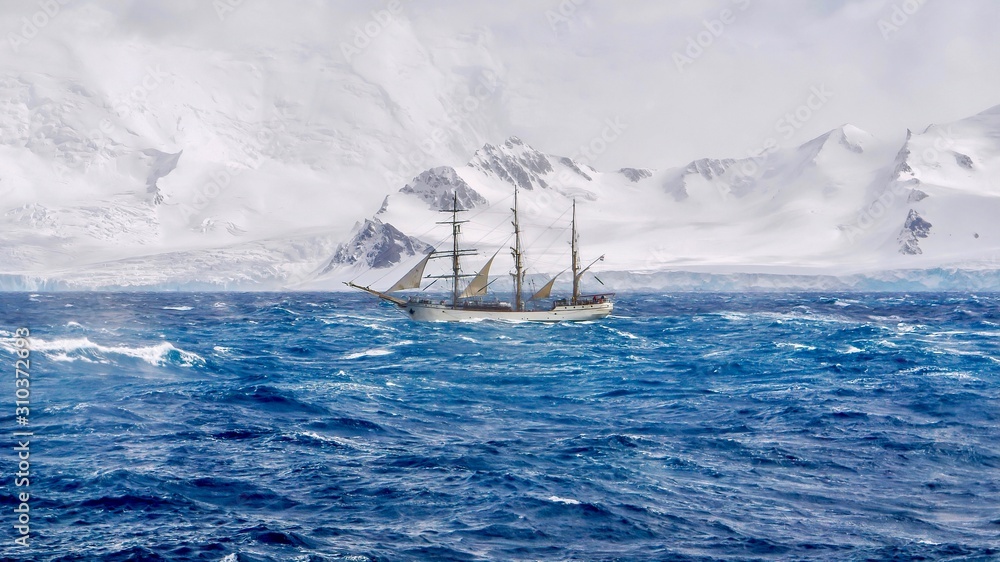 Tableau sur toile Extreme sailing conditions in Antarctica, as a three masted schooner sails south in a gale, passing the snow-capped mountains and glaciers of the South Shetland Islands