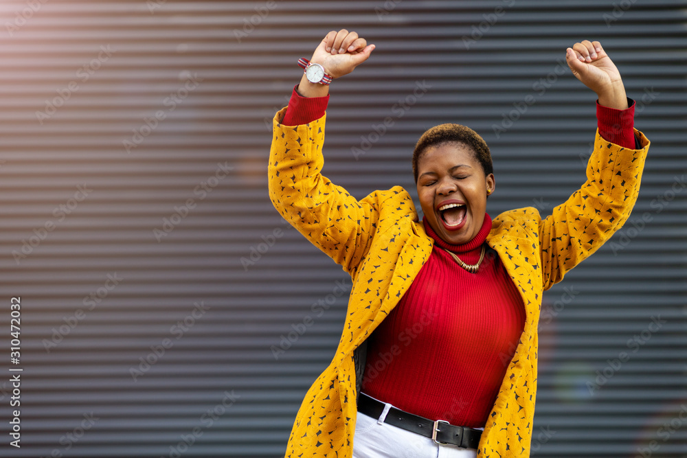 Tableau sur toile Joyous woman with arms raised in front of a wall