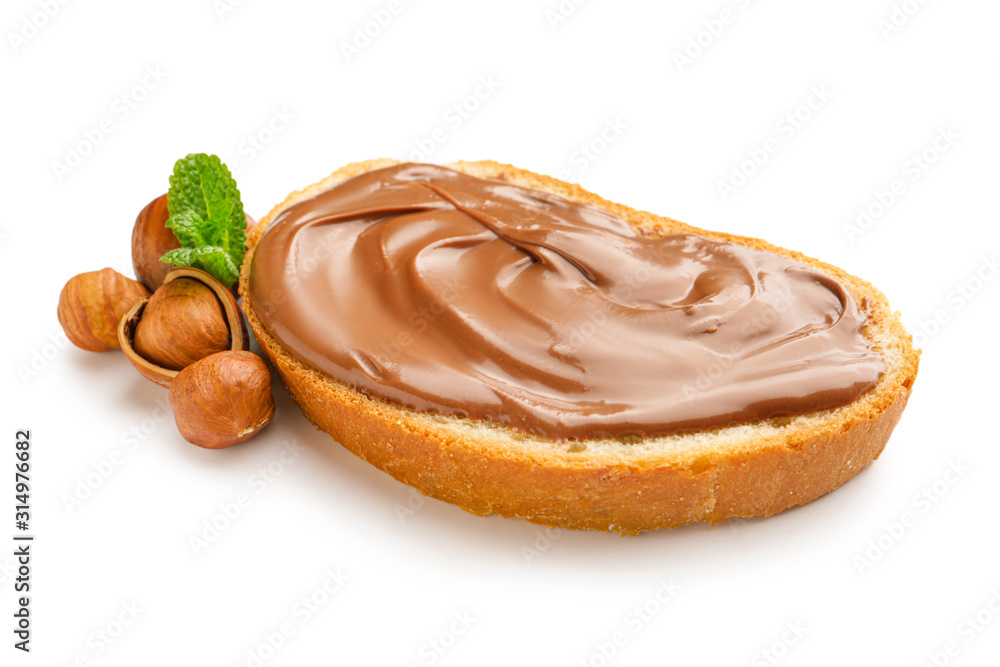 Tableau sur toile Fresh bread with chocolate paste on white background