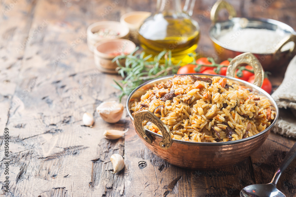 Tableau sur toile Lamb pilaf in a bowl on wooden rustic background with copy space