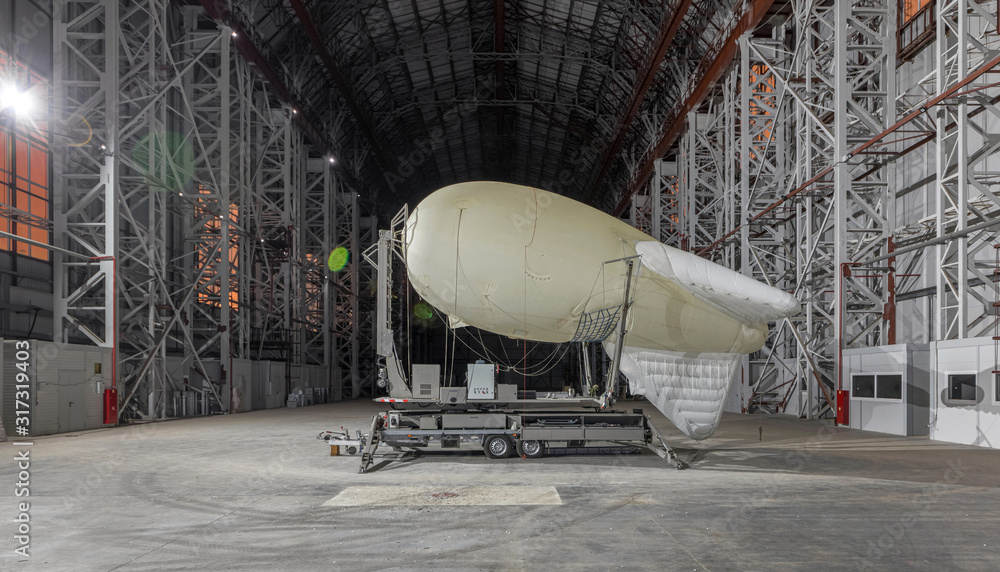 Tableau sur toile Small blimp on a mooring platform inside a giant airship hangar
