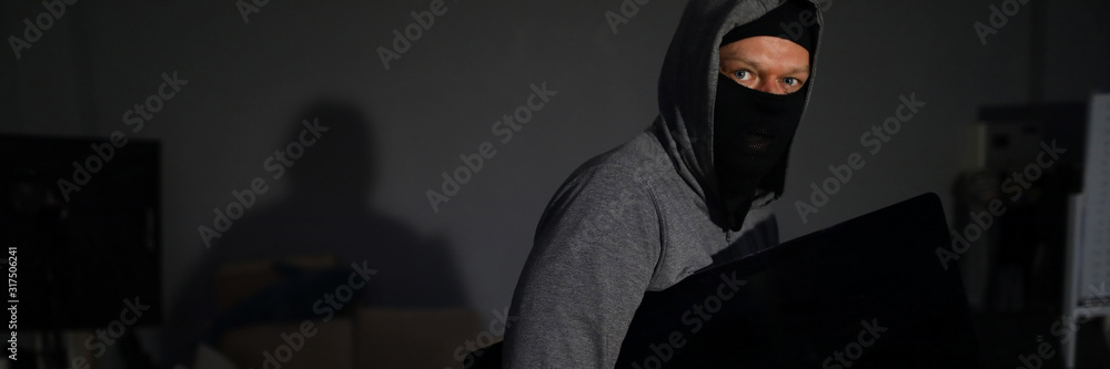 Tableau sur toile Portrait of male thug standing in dark room and holding expensive televisor from popular company