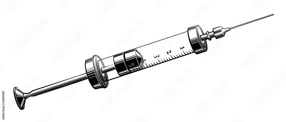 Glass syringe vector illustration in black and white. Hand drawn vintage syringe in ink.