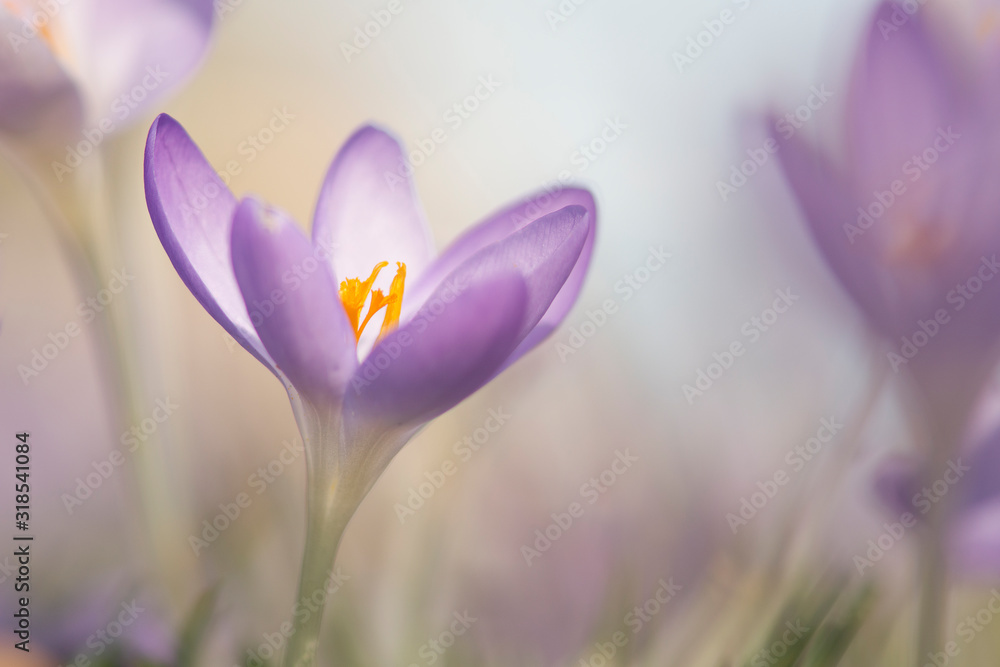 Tableau sur toile Blooming purple crocus flowers in a soft focus on a sunny spring day