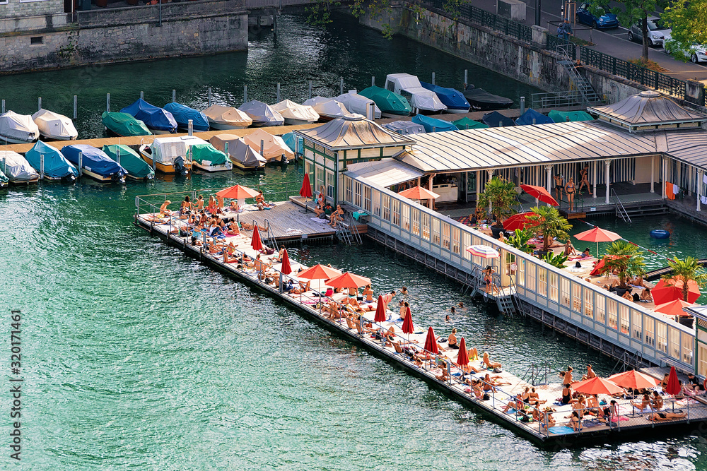 Tableau sur toile Women beach at Limmat River quay in the city center in Zurich, Swiss