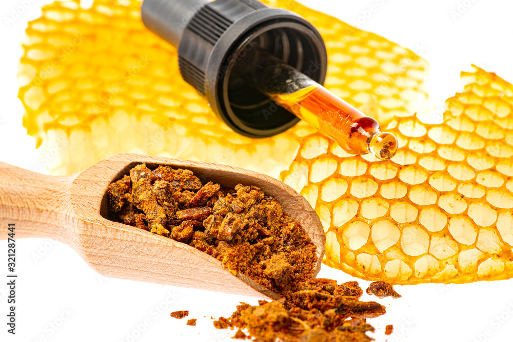 Tableau sur toile propolis tincture and a wooden spoon of propolis granules