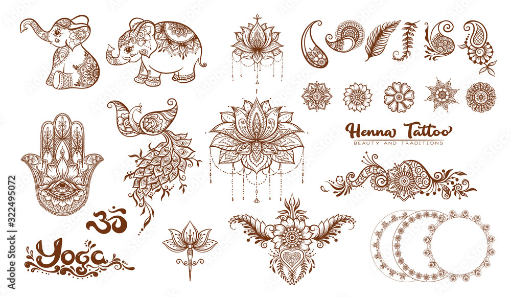 Tableau sur toile Set of elements for design in mehendi, traditional indian henna style