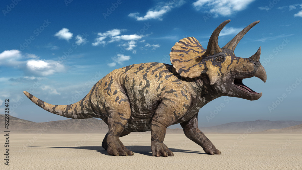 Tableau sur toile Triceratops, dinosaur reptile roaring, prehistoric Jurassic animal in deserted n