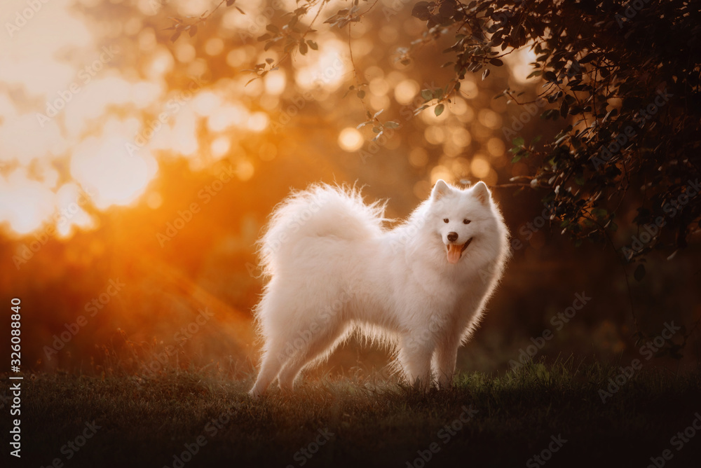 Tableau sur toile happy samoyed dog posing outdoors at sunset in summer