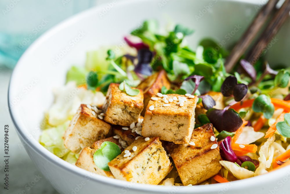Tableau sur toile Fried tofu salad with sprouts and sesame seeds in white bowl